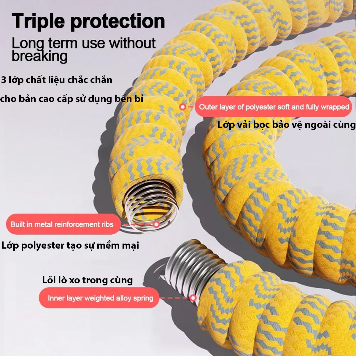 -Thiết kế 3 lớp: Lõi lò xo, lớp đệm polyester và lớp ngoài cùng bằng vải hoặc lông nhung tùy vào phân loại: Giúp bảo vệ êm ái cho vòng eo khi tập luyện, hầu như không gây tiếng ồn, không gây đau, trầy xước da.