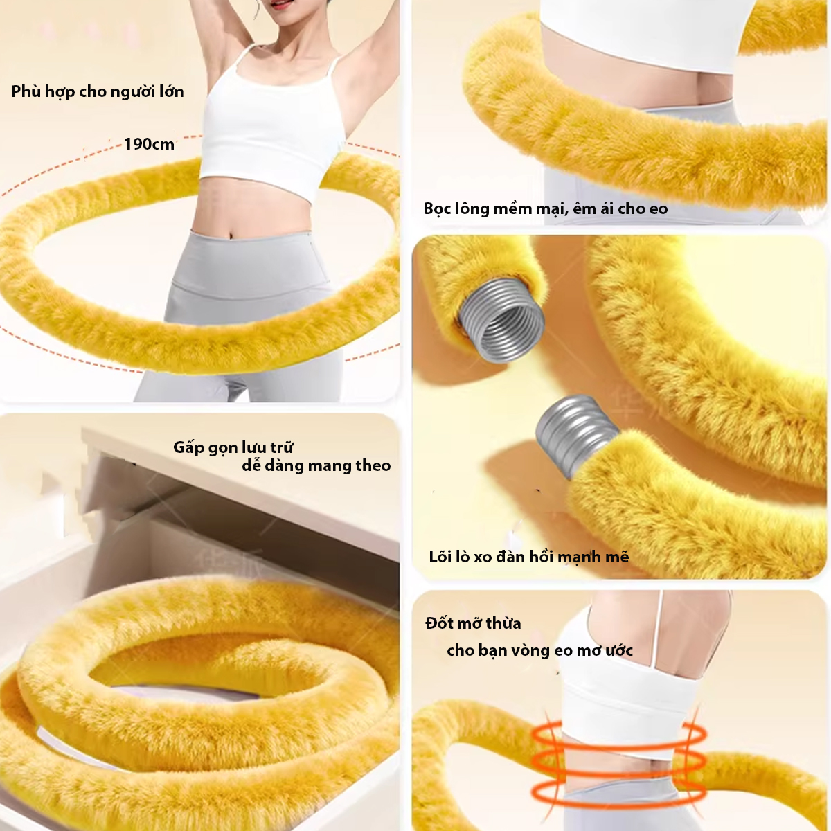 Công dụng vòng dây lắc eo lõi lò xo tập thể dục tại nhà giảm mỡ bụng giảm cân, rope hula hoop tập cơ hông kegel nhiều mức tạ