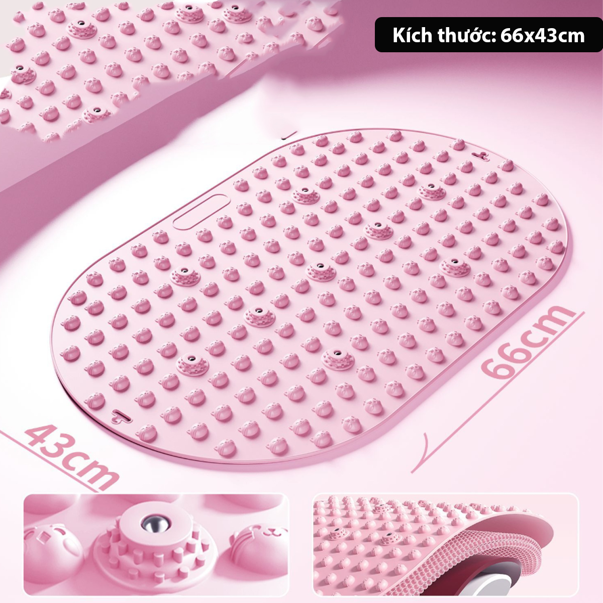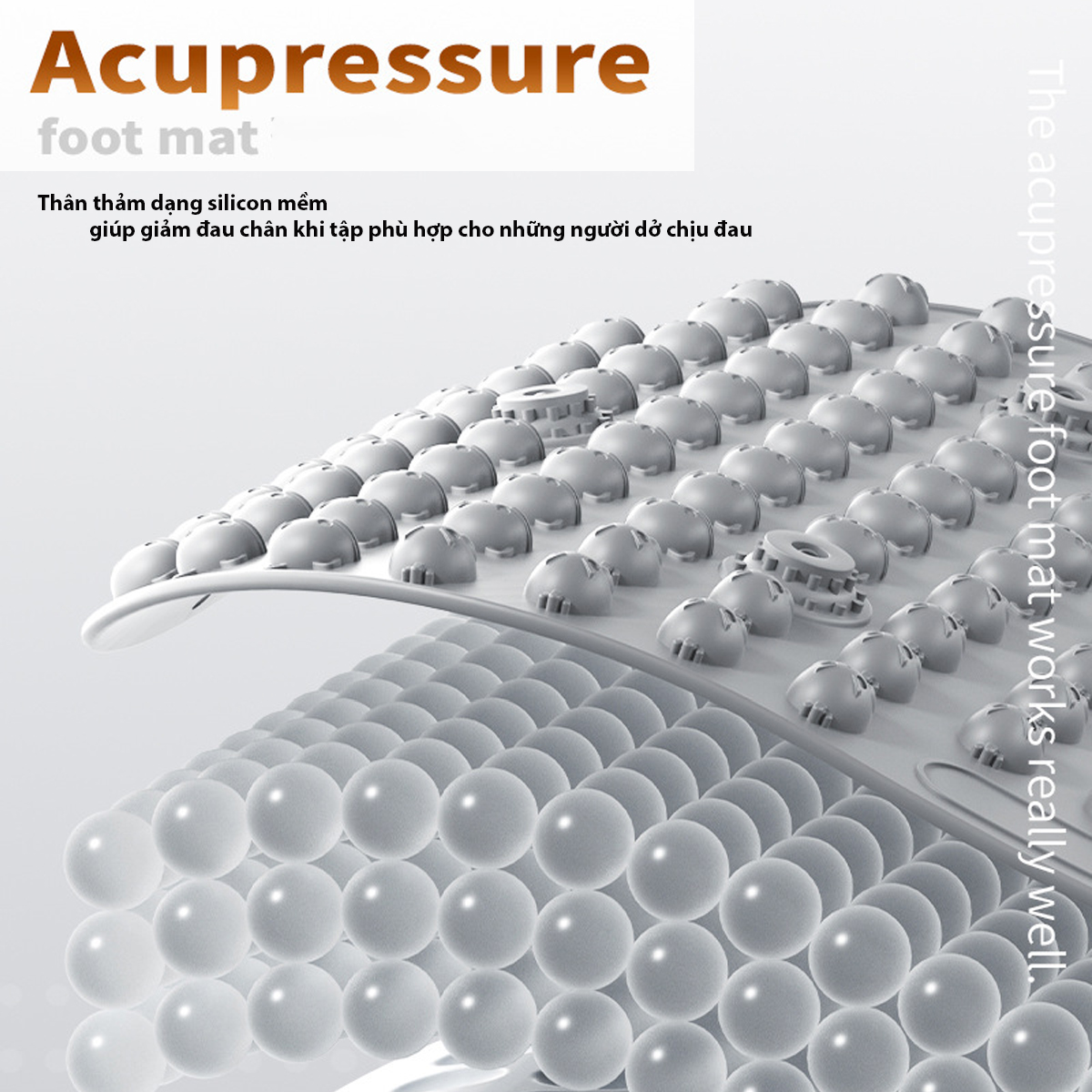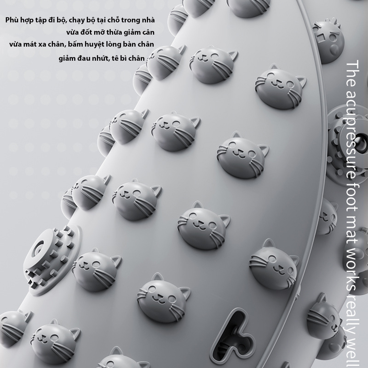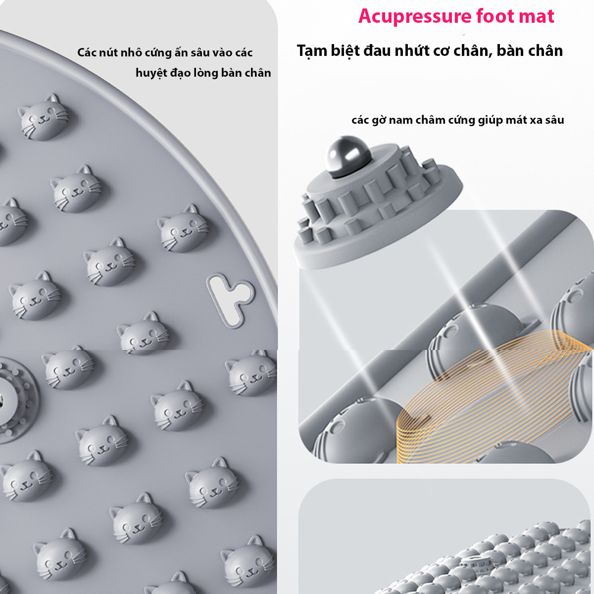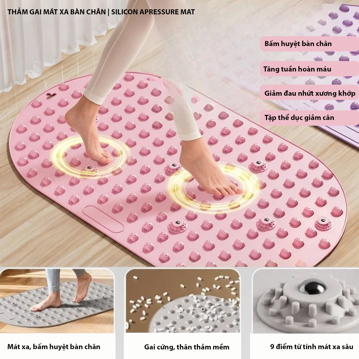 -Mát xa,bấm huyệt bàn chân: Hàng trăm gai mềm tác động trực tiếp vào các huyệt đạo, giúp kích thích tuần hoàn máu, giảm mỏi chân. Trên thảm còn các gai cứng từ tính giúp bấm huyệt sâu cho bàn chân.
