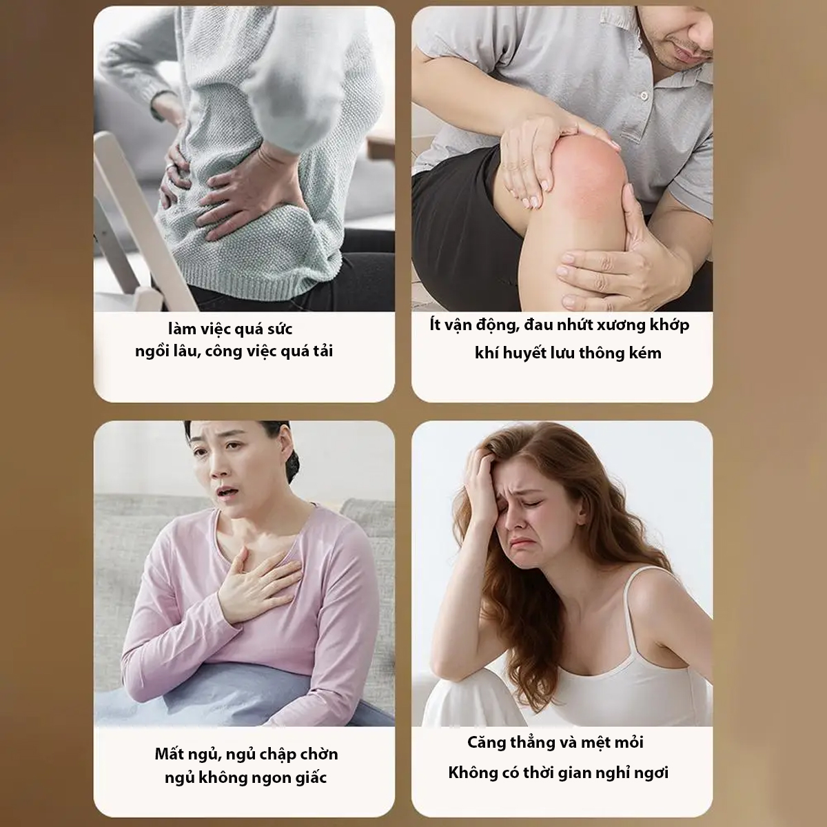 -Nhân viên văn phòng, người lớn tuổi do ngồi làm việc lâu, quá sức, ít có thời gian thư giãn nghỉ ngơi.